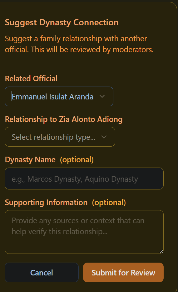 please add auto suggest when typing in the names of person specially when adding or suggest political dynasty. This will make QoL, and if necessary apply it to all searchable entries. I found it the reason Political dynasties are empty because it's difficult to search the name.