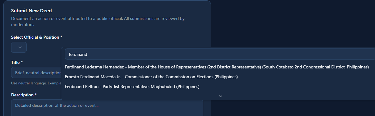 1. Click submit deed 2. Add names Ferdinand or Sara. 3. PBBM and VP names are not in the list