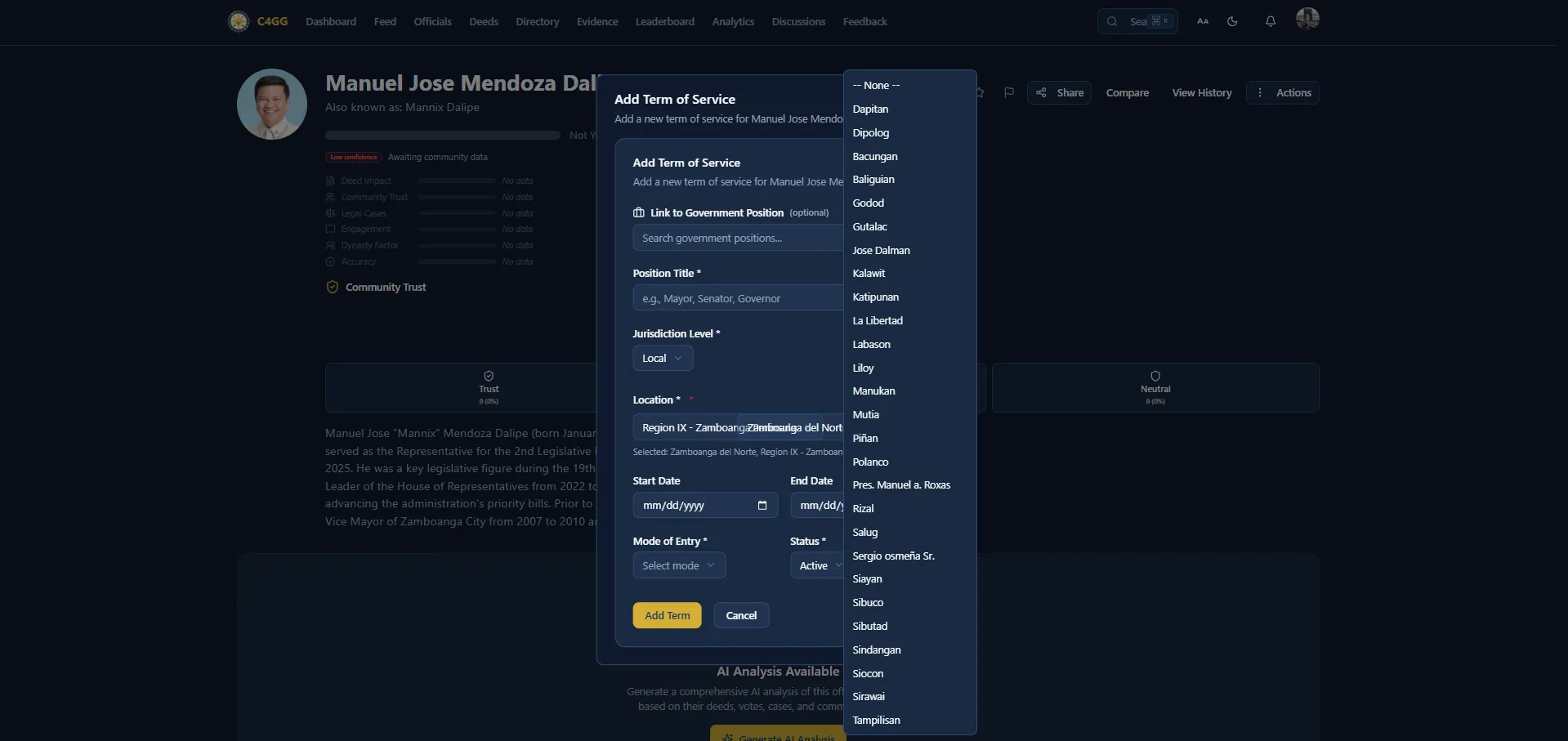 1. Add term of service 2. Under Jurisdiction Level, select "Local" 3. Under Region: Region IX Zamboanga Peninsula 4. Under Province: Select any province to proceed with the City/Municipality 5. Under Municipality: NO ZAMBOANGA CITY available since it is not under any of these province.